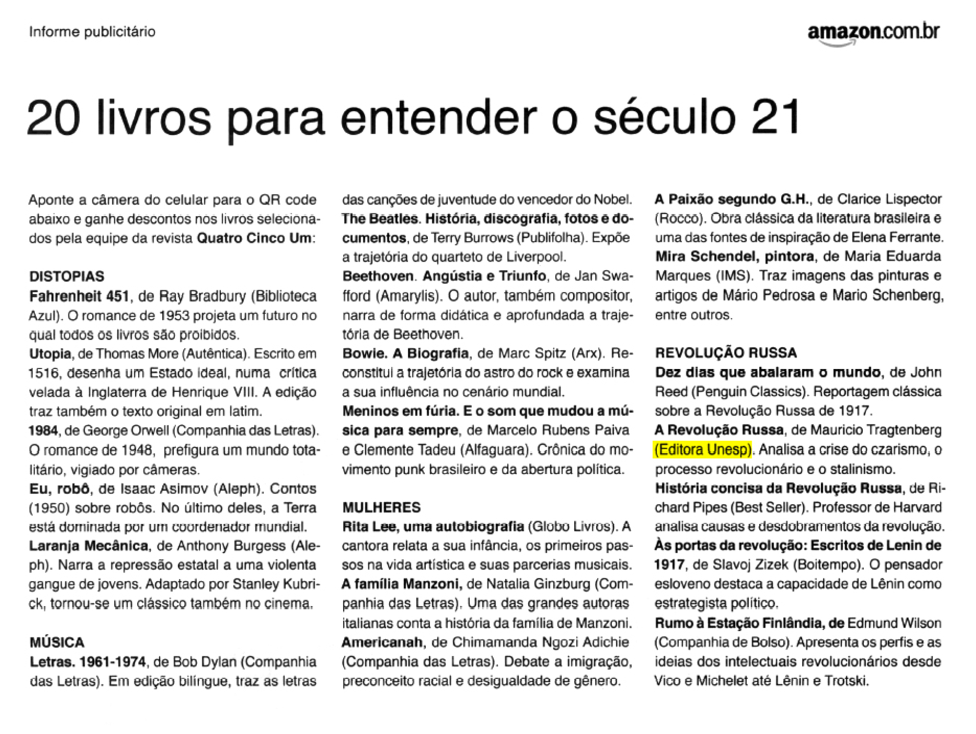 Em sua edição de estreia, em maio, a nova revista sobre livros Quatro Cinco Um, faz uma seleção de livros para entender o século XXI. Entre eles, A Revolução Russa, de Maurício Tragtenberg. O livro, publicado pela primeira vez em 1988, poucos meses antes do desmoronamento da URSS, tem um sentido premonitório: dotado de alta força crítica, percorre os caminhos e descaminhos daquela sociedade, desde a gênese do czarismo, anterior à Revolução de 1917, passando pelos longos, difíceis e tortuosos períodos que configuraram a processualidade russa, até chegar às vésperas de seu definhamento.