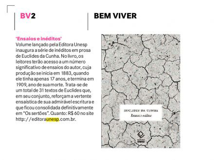 O jornal A Crítica, de Manaus, recomendou a leitura do lançamento Ensaios e inéditos, de Euclides da Cunha, organizado por Leopoldo M. Bernucci e Felipe Pereira Rissato. Com o presente volume, que inaugura a série de inéditos em prosa de Euclides da Cunha, os leitores terão acesso a um número significativo de ensaios do autor, cuja produção se inicia em 1883, quando ele tinha apenas 17 anos, e termina em 1909, ano de sua morte. Trata-se de um total de 31 composições de Euclides que, em seu conjunto, reforçam a vertente ensaística de sua admirável escritura e que ficou consolidada definitivamente em Os sertões.