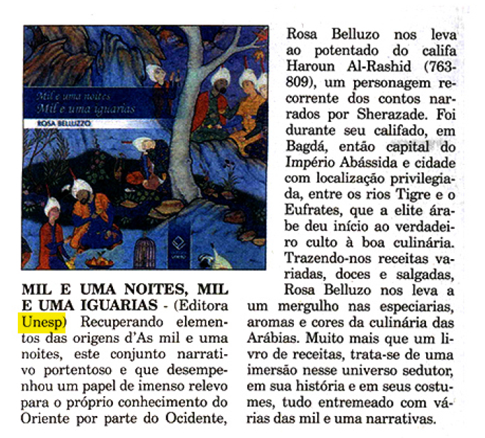 A Gazeta da Zona Norte, em sua edição de 20 de outubro, recomendou o lançamento Mil e uma noites, mil e uma iguarias, de Rosa Belluzzo. Trazendo-nos receitas variadas, doces e salgadas, Rosa Belluzo nos leva a um mergulho nas especiarias, aromas e cores da culinária das Arábias. Muito mais que um livro de receitas, trata-se de uma imersão nesse universo sedutor, em sua história e em seus costumes, tudo entremeado com várias das mil e uma narrativas.
