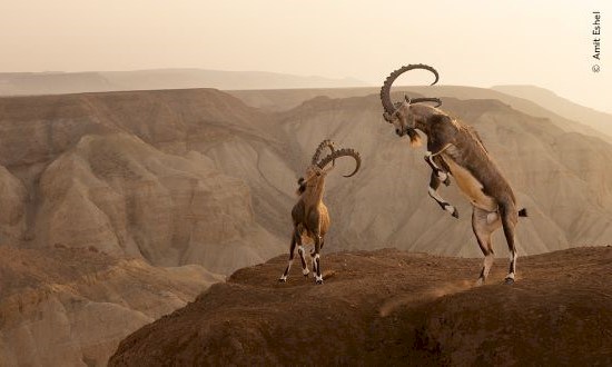 Imagem “Life on the Edge” (A Vida no Limite), de autoria de Amit Eshel, vencedora da categoria Animals in their Enviroment [Animais em seu Ambiente], que testemunha o confronto dramático no penhasco entre dois íbex-da-núbia (Crédito: Amit Eshel/Divulgação)