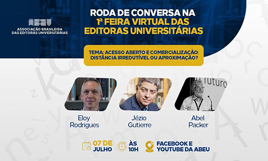 A Abeu (Associação Brasileira das Editoras Universitárias) promove debate ao vivo na próxima terça-feira, 7 de julho, às 10h, sobre o tema Acesso aberto e comercialização: distância irredutível ou aproximação?, com a participação do diretor-presidente da Fundação Editora da Unesp e diretor de difusão da Abeu, Jézio Hernani B. Gutierre, Abel Packer (diretor do Programa SciELO / FAPESP) e Eloy Rodrigues (diretor dos Serviços de Documentação da Universidade do Minho).