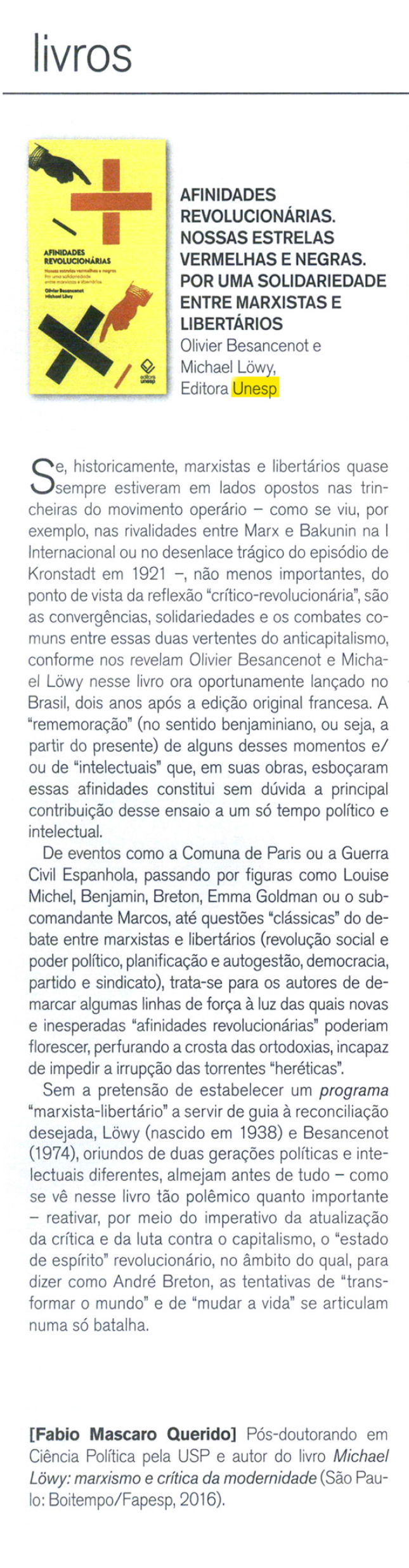 Fabio Mascaro Querido resenha, na edição de janeiro do Le Monde Diplomatique Brasil, a obra Afinidades revolucionárias: nossas estrelas vermelhas e negras. Por uma solidariedade entre marxistas e libertários.