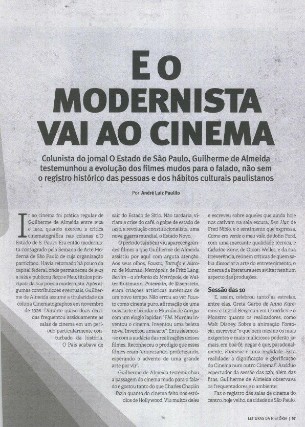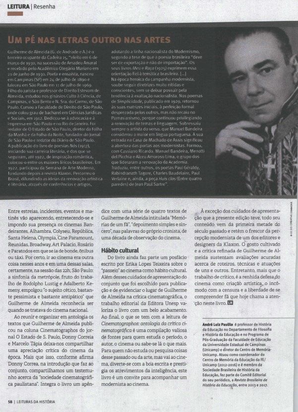 A revista Leituras da História publicou resenha de André Luiz Paulilo sobre o livro Cinematographos: antologia da crítica cinematográfica, de Guilherme de Almeida.