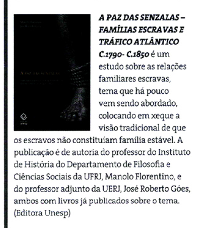 A revista Caros Amigos, em sua edição de setembro, indicou a leitura do lançamento A paz das senzalas: Famílias escravas e tráfico atlântico c.1790- c.1850, de Manolo Florentino e José Roberto Góes. Este esforço de investigação é um capítulo particularmente interessante dos estudos históricos recentes sobre a escravidão, porque contém modulações importantes não apenas no estilo de conceber as relações familiares escravas, mas também de interrogar o passado e reescrever a história.