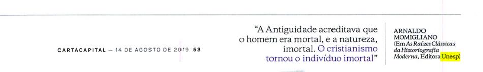 A Carta Capital destacou um fragmento de As raízes clássicas da historiografia moderna, de Arnaldo Momigliano. Nestes ensaios de reconhecida erudição, o campo da historiografia clássica e contemporânea é integrado, dissecado e exposto em toda sua apaixonante complexidade.