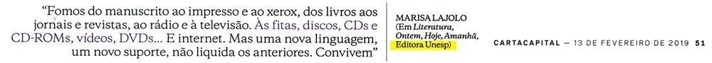 A Carta Capital, em sua edição de 13 de fevereiro, destacou um trecho do livro Literatura: ontem, hoje e amanhã, de Marisa Lajolo. O livro volta-se ao público com uma provocação: o que é a literatura? A pergunta aparentemente simples guarda inúmeras armadilhas. Quais os limites da literatura? Quais são os seus tipos, suas modalidades, seus gêneros? E, mais que isso: como a ideia do que é literatura se alterou com o tempo? Para todas as idades, este texto, por seu tom saborosamente literário, acaba ele mesmo sendo objeto entre os territórios investigados em suas páginas.