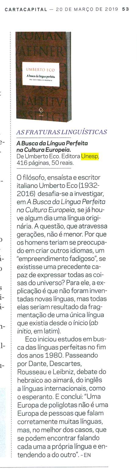 A Carta Capital, em sua edição de 20 de março, recomendou a leitura de A busca da língua perfeita na cultura europeia, de Umberto Eco. Neste livro, o autor investiga esse projeto utópico de se descobrir uma língua original, perfeita e única para todo o gênero humano.