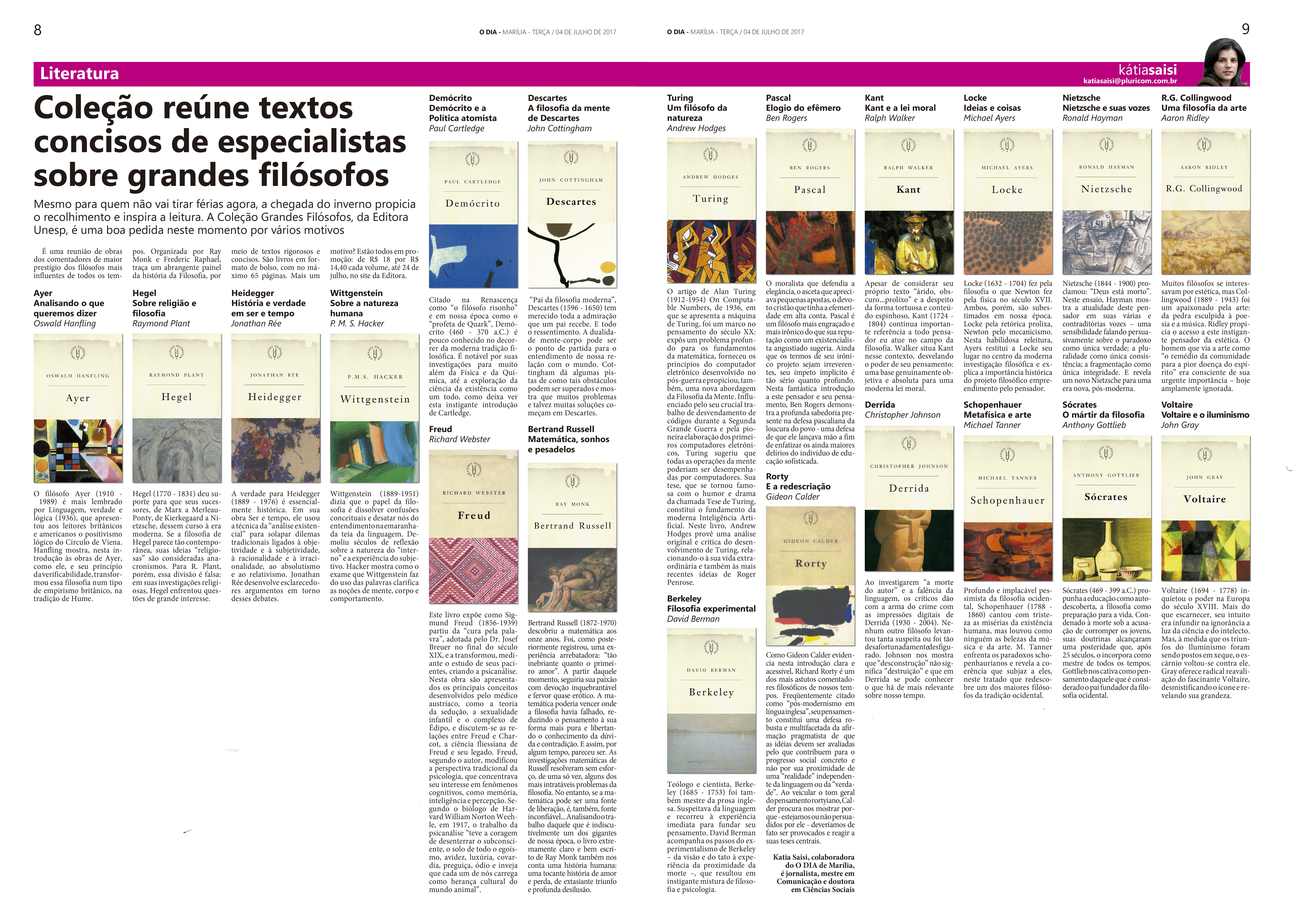 O jornal O Dia de Marília, em sua edição de 4 de julho de 2017, destacou os livros da Coleção Grandes Filósofos. Nesta coleção, Monk & Raphael montam um painel geral da história da Filosofia, no qual os autores mais influentes são analisados pelos comentadores de maior prestígio em cada área. O objetivo desta coleção é, assim, apresentar ao leitor o pensamento dos principais nomes da Filosofia, por meio de textos ao mesmo tempo rigorosos, elucidativos e concisos. A estratégia é concentrar as análises nos eixos básicos que articulam as obras em questão. Dessa forma, cada filósofo é introduzido pela elucidação de suas principais posições.
