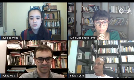 O evento contou com a participação da professora da UFMG Aline Magalhães Pinto, do professor-adjunto da Universidade Federal de Juiz de Fora Felipe Maia, do professor do Colégio Pedro II e doutor em filosofia pela UERJ Fábio Costa e do pesquisador e diretor do Ateliê de Humanidades, André Magnelli, com mediação de Júlia de Mello (doutoranda na UFSCar).