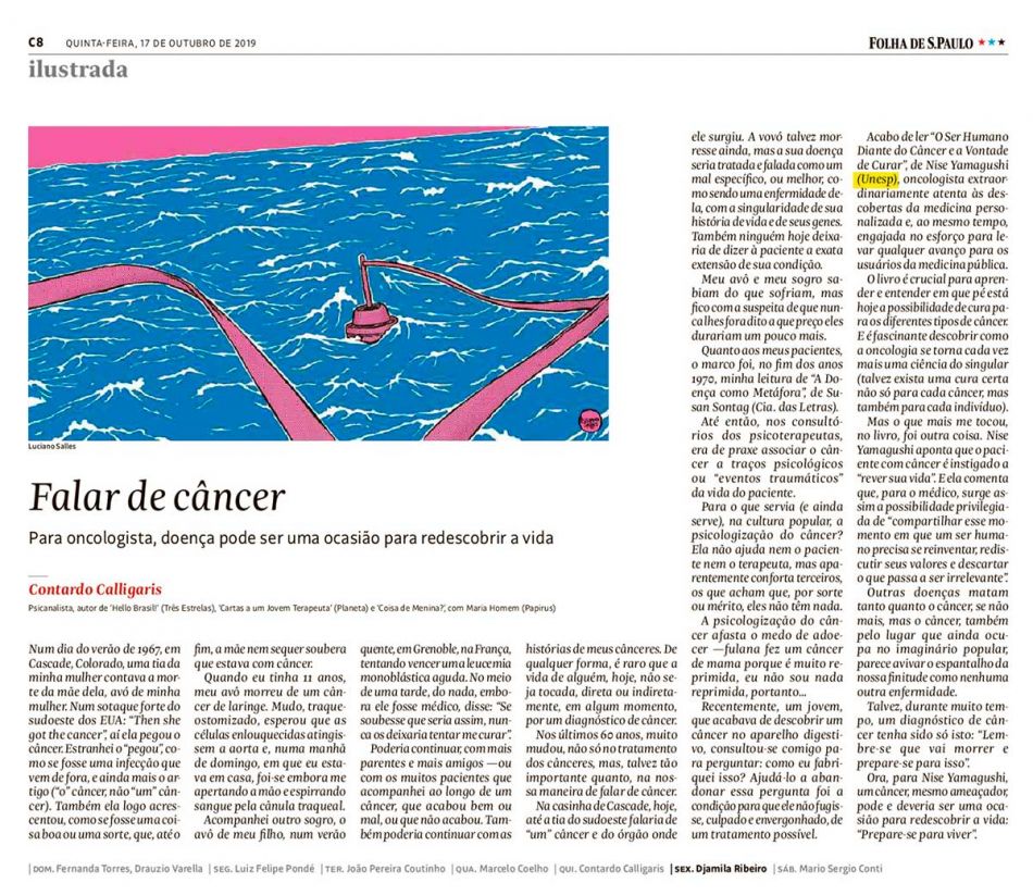 Contardo Calligaris, em sua coluna na Folha de S.Paulo, recomendou o lançamento O ser humano diante do câncer e a vontade de curar: a visão de uma oncologista humanista, de Nise H. Yamaguchi. Este livro faz parte de um panorama mais promissor associado ao aprimoramento de conhecimento e protocolos clínicos e às possibilidades cada vez maiores de cura definitiva para o câncer. Combinando ferramentas de autoconhecimento oriundas tanto de culturas orientais como de ocidentais, psicologia e medicina de ponta, o texto que chega ao público neste momento pretende contribuir para pavimentar caminhos de esperança, serenidade e perseverança.