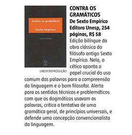 A edição bilíngue da obra clássica do filósofo antigo Sexto Empírico. Nela, o cético aponta o papel crucial do uso comum das palavras para a compreensão da linguagem e o bom filosofar. Alerta para os sentidos técnicos e problemáticos com que os dogmáticos usavam as palavras, critica a tentativa de uma gramática geral, de princípios universais, e defende uma concepção convencionalista da linguagem.