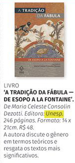 O Correio da Paraíba, em sua edição de 6 de janeiro, indicou a leitura do lançamento A tradição da fábula: de Esopo a La Fontaine, organizado por Maria Celeste Consolin Dezotti.