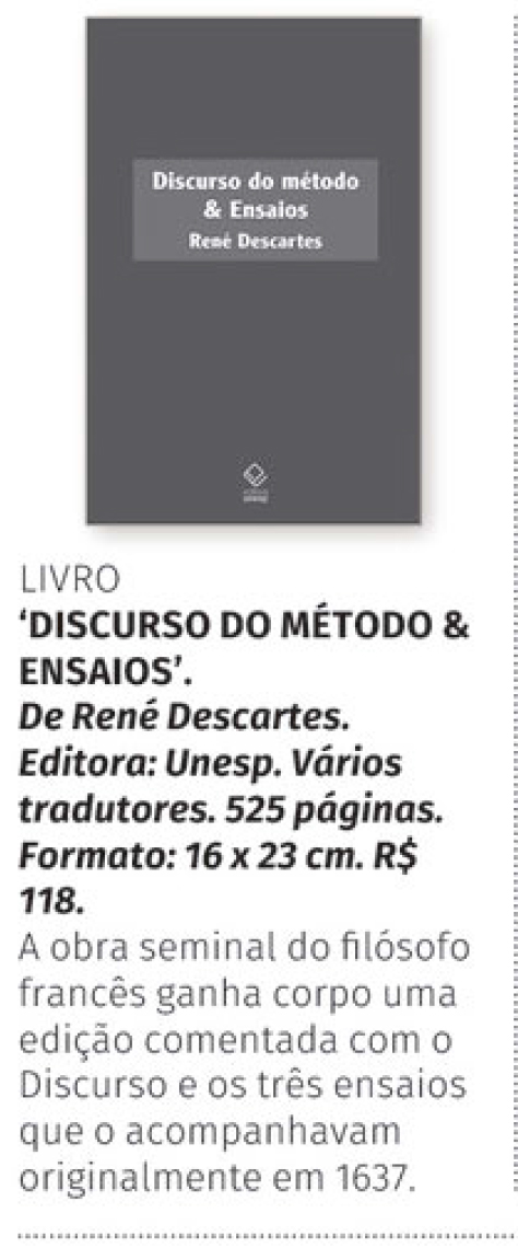 O Correio da Paraíba, em sua edição de 18 de novembro, indicou a leitura do lançamento Discurso do método & Ensaios, de René Descartes. A obra anuncia explicitamente o advento de uma filosofia prática que promove a união entre a ciência e a técnica, dando o primeiro passo para o nascimento da tecnologia, entendida como racionalização científica (metódica) da técnica, para tornar efetivo o ato técnico de controle (domínio) da natureza, cuja possibilidade se assenta na concepção de que a natureza é simples matéria em movimento, desprovida de qualquer finalidade intrínseca.