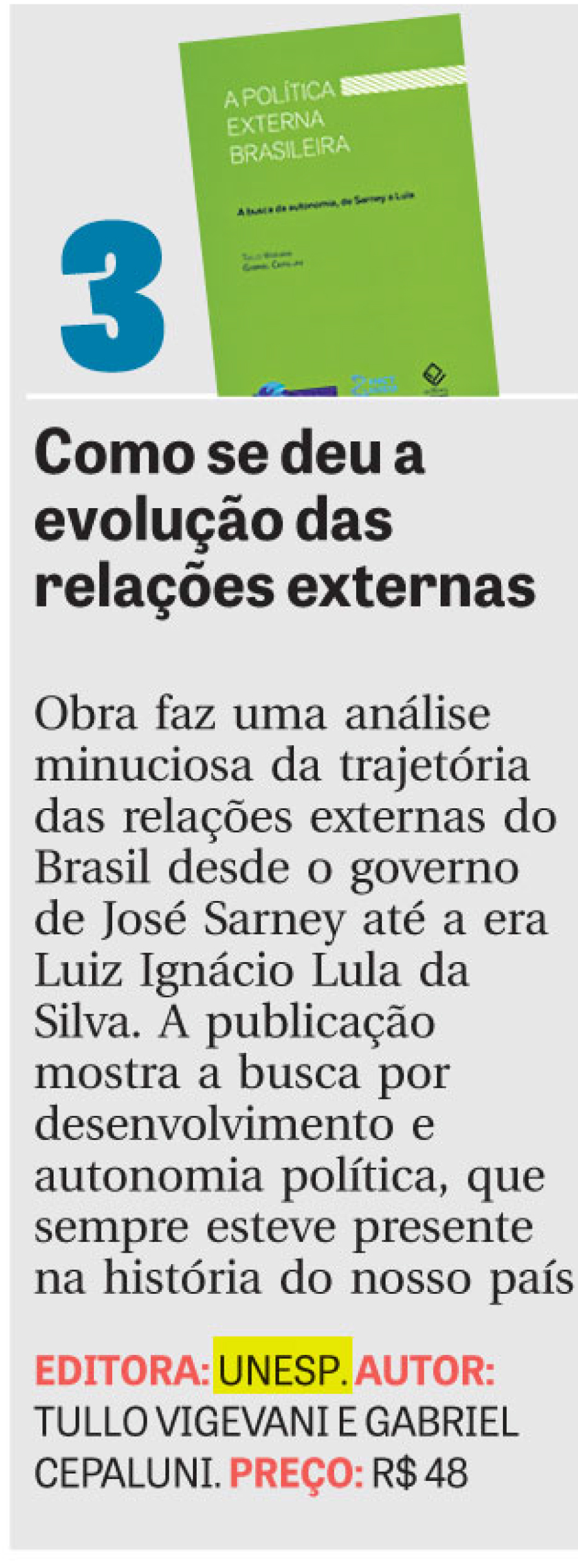 O jornal DCI recomendou, em 13 de abril de 2017, a leitura do livro A política externa brasileira - 2ª edição, de Tullo Vigevani, Gabriel Cepaluni. Neste livro, originalmente publicado em inglês pela Lexington Books (2009) e que agora ganha sua segunda edição em português, os autores delineiam, de maneira clara e encadeada, o caminho histórico que o Brasil percorreu desde então em sua política externa: Sarney e as pressões para a mudança; Collor/Itamar Franco e o turbulento governo que deu início às transformações liberais; Fernando Henrique Cardoso e a absorção e consolidação de mudanças resultantes da globalização, levando à autonomia pela participação; e Lula, com sua ênfase nas negociações comerciais internacionais e na busca de aprofundamento da coordenação política com países em desenvolvimento.