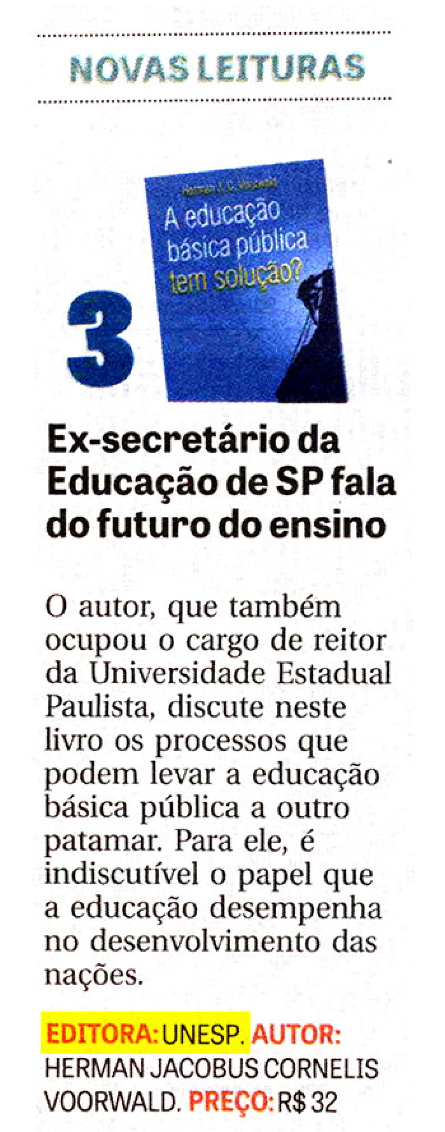 O jornal DCI, em sua edição de 26 de outubro, indicou o lançamento A educação básica pública tem solução?, de Herman J. C. Voorwald. Este livro, redigido com base na experiência do autor junto aos profissionais da rede pública de educação, tem como objetivo mostrar a viabilidade de uma construção conjunta com a rede de uma política pública de educação de qualidade.