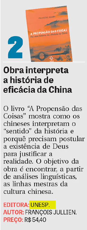 O jornal DCI indicou, em 13 de julho de 2017, a leitura do lançamento A propensão das coisas, de François Jullien. O objetivo da obra é encontrar, a partir da extrapolação de análises linguísticas, as linhas mestras subjacentes à cultura chinesa.