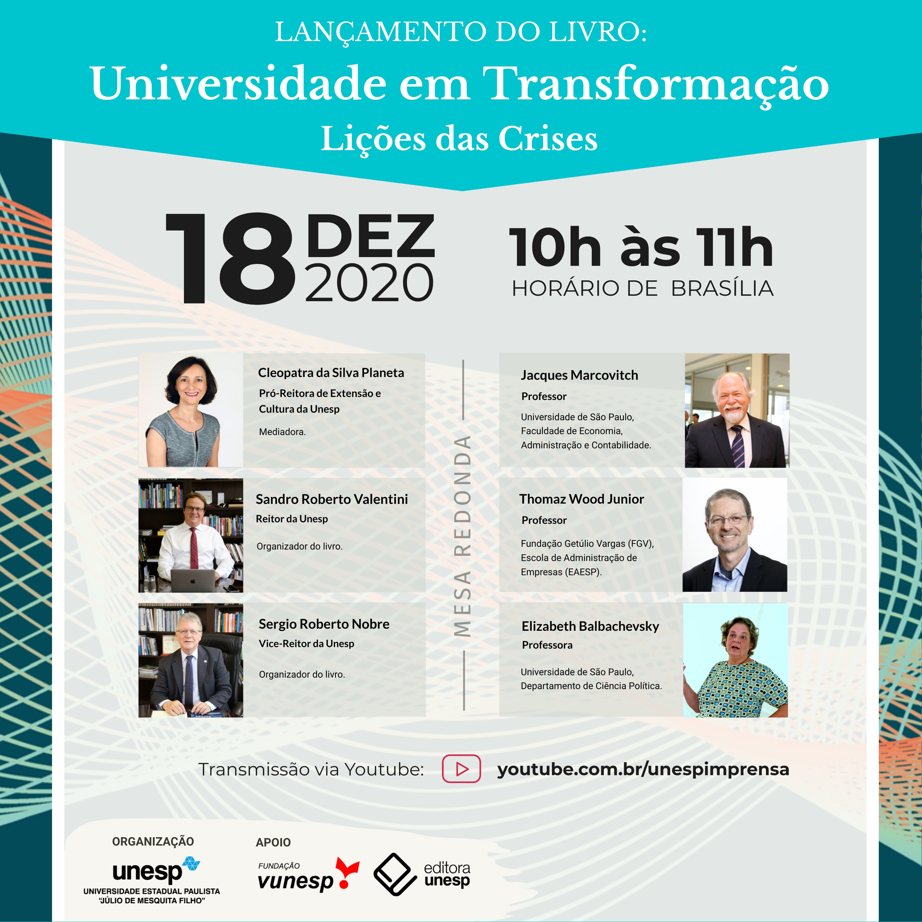 No dia 18 de dezembro (sexta-feira), às 10h, será realizado o lançamento virtual do livro Universidade em Transformação: lições das crises, durante live que será transmitida pelo canal do Youtube da Assessoria de Comunicação e Imprensa da Unesp (a transmissão será feita também pelo Facebook da Unesp).