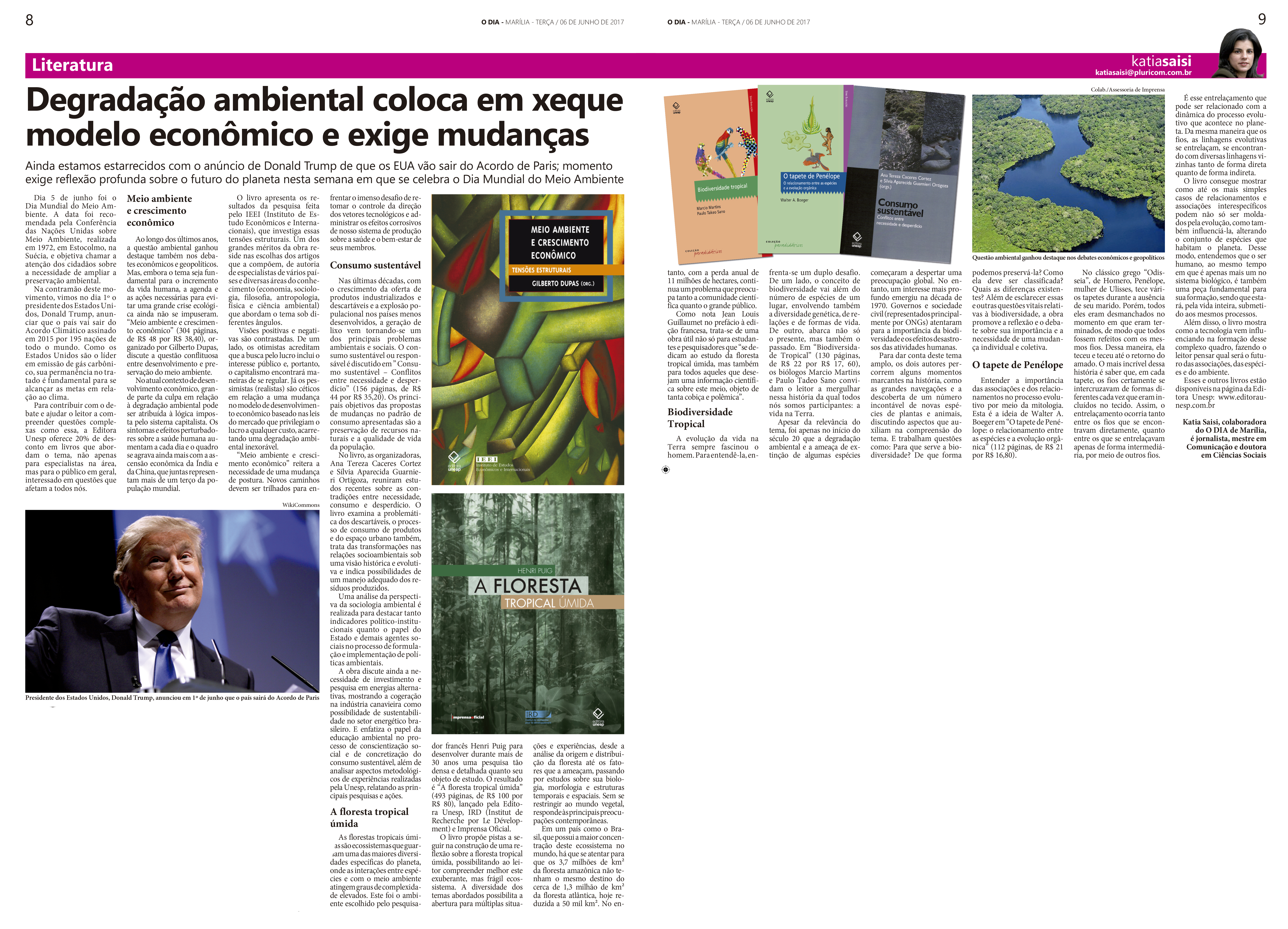 O jornal O Dia de Marília, em sua edição de 6 de junho de 2017, indicou a leitura de livros sobre o meio ambiente da Editora Unesp. Alguns títulos relacionados ao assunto estão com 20% de desconto até 12 de junho. Confira aqui