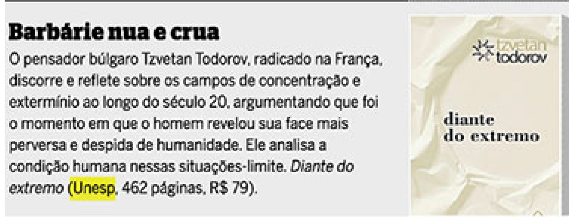 O jornal Diário de Pernambuco, em sua edição de 17 de fevereiro de 2018, recomendou a leitura do livro Diante do extremo, de Tzvetan Todorov. O autor mergulha em vasta literatura memorialista dos sobreviventes de campos de concentração, nazistas e soviéticos, e em depoimentos de agentes desses regimes para nos mostrar que a vida nesses lugares, ao contrário do que é comum que se acredite, não perdeu sua dimensão moral.