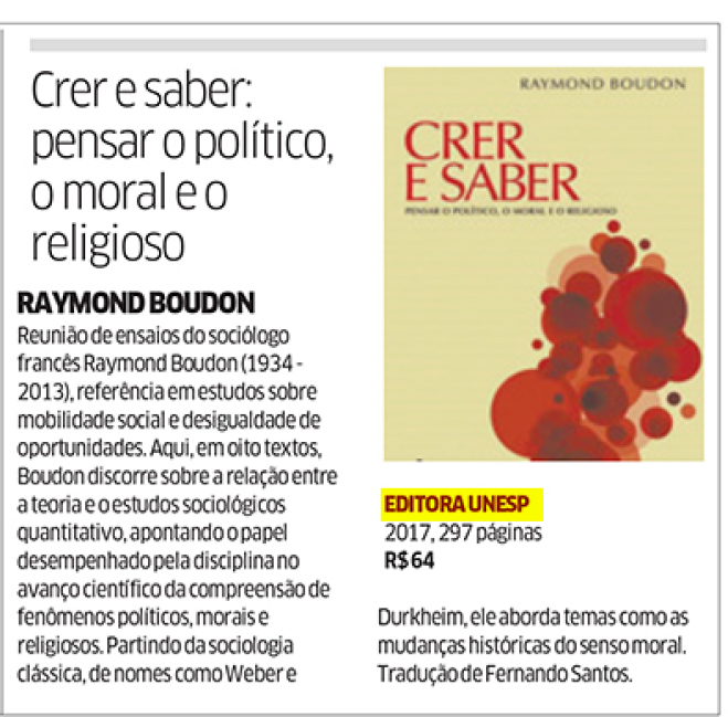 O jornal Diário do Nordeste, em sua edição de 31 de dezembro de 2017, indicou a leitura do lançamento Crer e saber: Pensar o político, o moral e o religioso, de Raymond Boudon. Nesta obra, Raymond Boudon realiza uma síntese dos temas centrais de sua trajetória intelectual, complementada por uma apreciação da sociologia clássica. O autor não se limita, entretanto, ao registro testamental de temas e autores que lhe são caros – como Max Weber e Émile Durkheim – e que constituem a torre teórica de seu pensamento.
