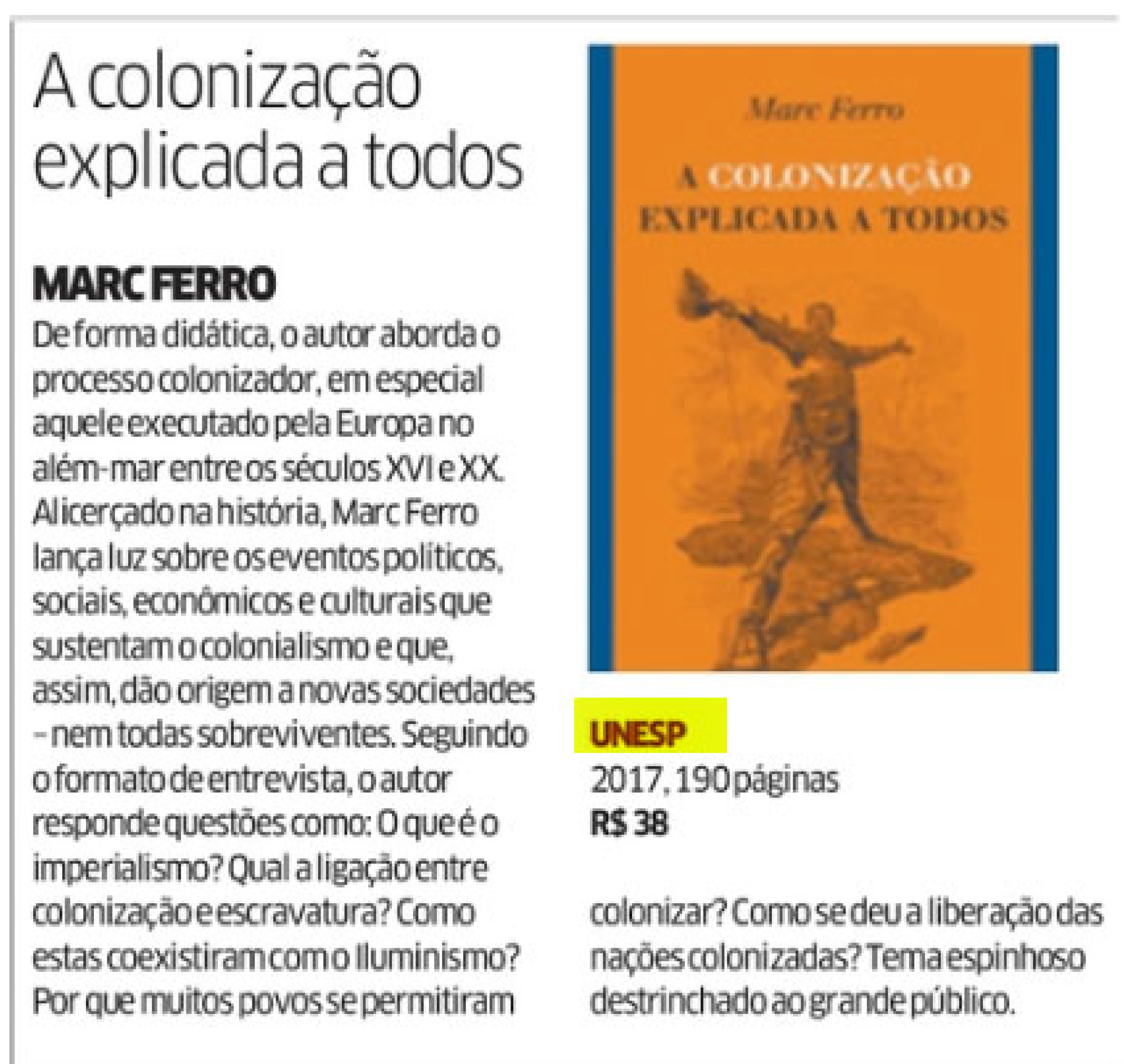 O jornal Diário do Nordeste, em sua edição de 23 de setembro, recomendou a leitura o lançamento A colonização explicada a todos, de Marc Ferro. De forma didática e atenciosa, Marc Ferro aborda neste livro o processo colonizador, em especial aquele levado a cabo pela Europa no além-mar entre os séculos XVI e XX. Alicerçado nos domínios da história, o autor lança luz sobre os eventos políticos, sociais, econômicos e culturais que sustentam o colonialismo e que, assim, dão origem a novas sociedades – das quais nem todas sobrevivem.