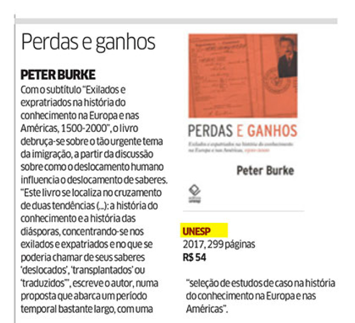 O jornal Diário do Nordeste, em sua edição de 20 de janeiro de 2018, indicou a leitura do lançamento Perdas e ganhos: exilados e expatriados na história do conhecimento na Europa e nas Américas, 1500-2000, de Peter Burke. Esta obra, a mais recente do historiador Peter Burke, debruça-se sobre um tema que, de tempos em tempos, torna-se especialmente candente: a migração humana. A história da humanidade confunde-se com a história das diásporas, catapultadas pela escassez, pela guerra, pela ambição. Afora os grandes movimentos migratórios, o deslocamento individual, ou de células familiares, permanece ativo diuturnamente no planeta.