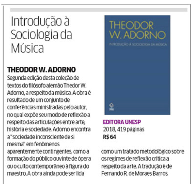 O Diário do Nordeste, em sua edição de 10 de fevereiro de 2018, recomendou a leitura da segunda edição de Introdução à Sociologia da música, de Theodor W. Adorno. Resultado de um conjunto de conferências ministradas por Adorno, este livro expõe seu modo de reflexão a respeito das articulações entre arte, história e sociedade. Adorno é capaz de encontrar a “sociedade inconsciente de si mesma” em fenômenos aparentemente contingentes, como a formação do público ouvinte de ópera ou o culto contemporâneo à figura do maestro.