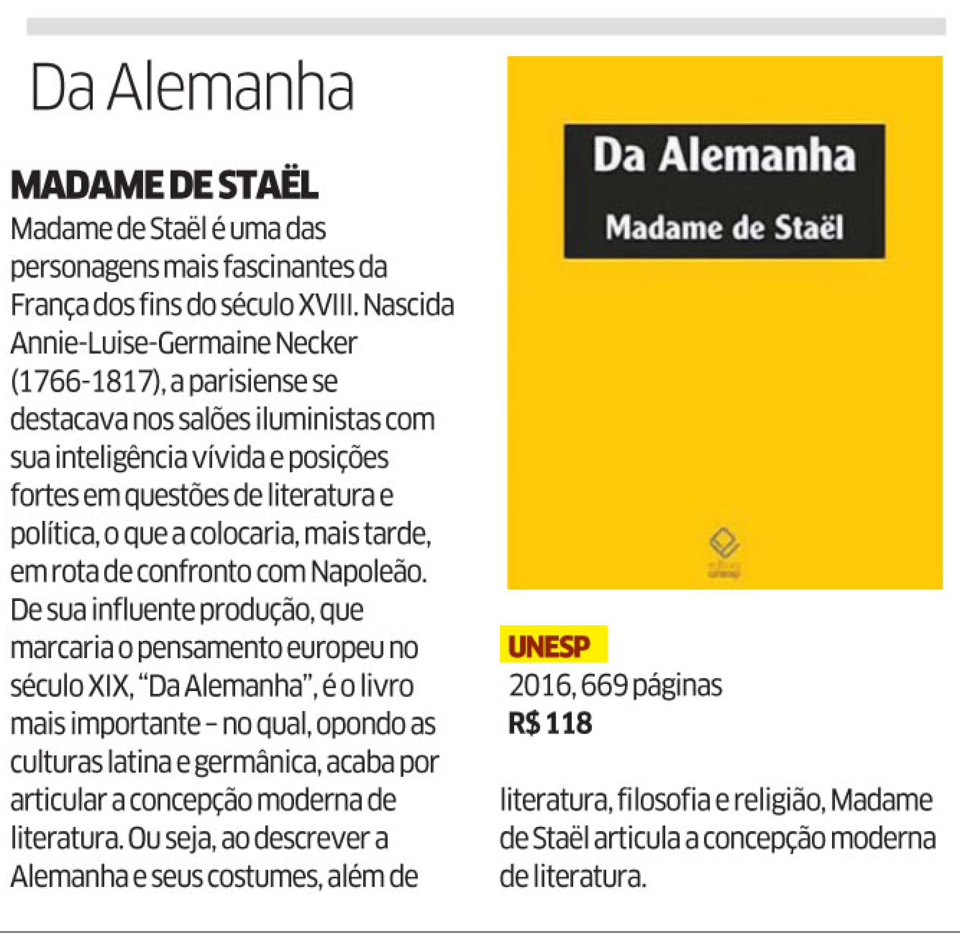 No último dia 29 de janeiro de 2017, o jornal Diário do Nordeste indicou a leitura do livro Da Alemanha, de Madame de Staël.