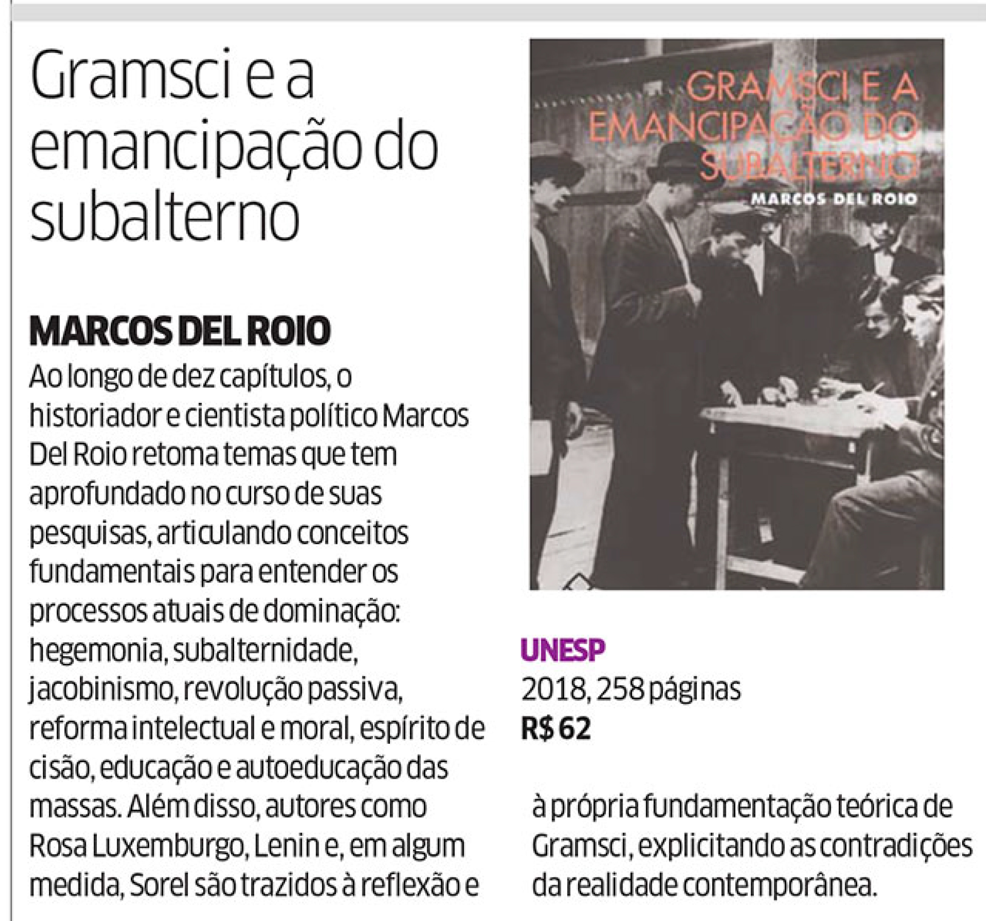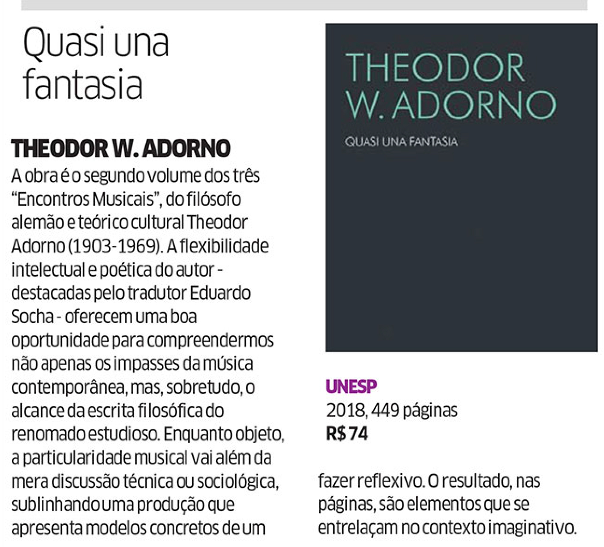 Quasi una fantasia, segundo volume dos três “Escritos musicais” de Adorno, estrutura-se em três grandes “movimentos”, nos quais se entrelaçam a imaginação expressiva do autor e a precisão conceitual. Já a obra de Marcos Del Roio destaca as observações de Gramsci sobre a subalternidade, que são muito importantes para se entender como operam os modos de dominação ou de adestramento da subjetividade.