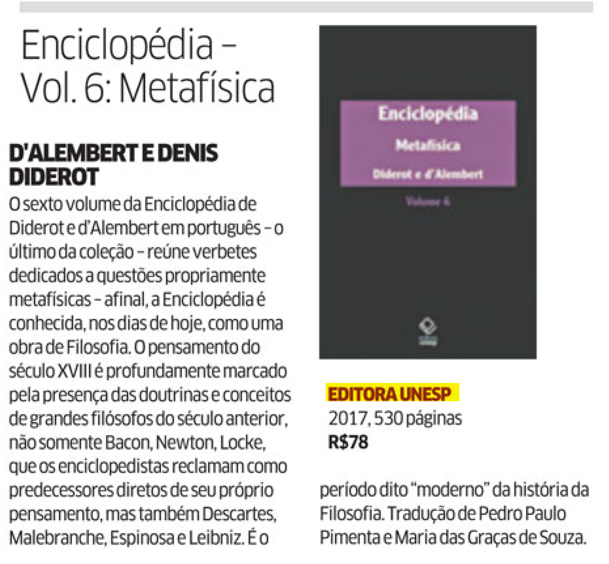 O jornal Diário do Nordeste, em sua edição de 16 de setembro, indicou a leitura do lançamento Enciclopédia, ou Dicionário razoado das ciências, das artes e dos ofícios - Vol. 6: Metafísica, de Denis Diderot e Jean le Rond d'Alembert. Confira a publicação abaixo: