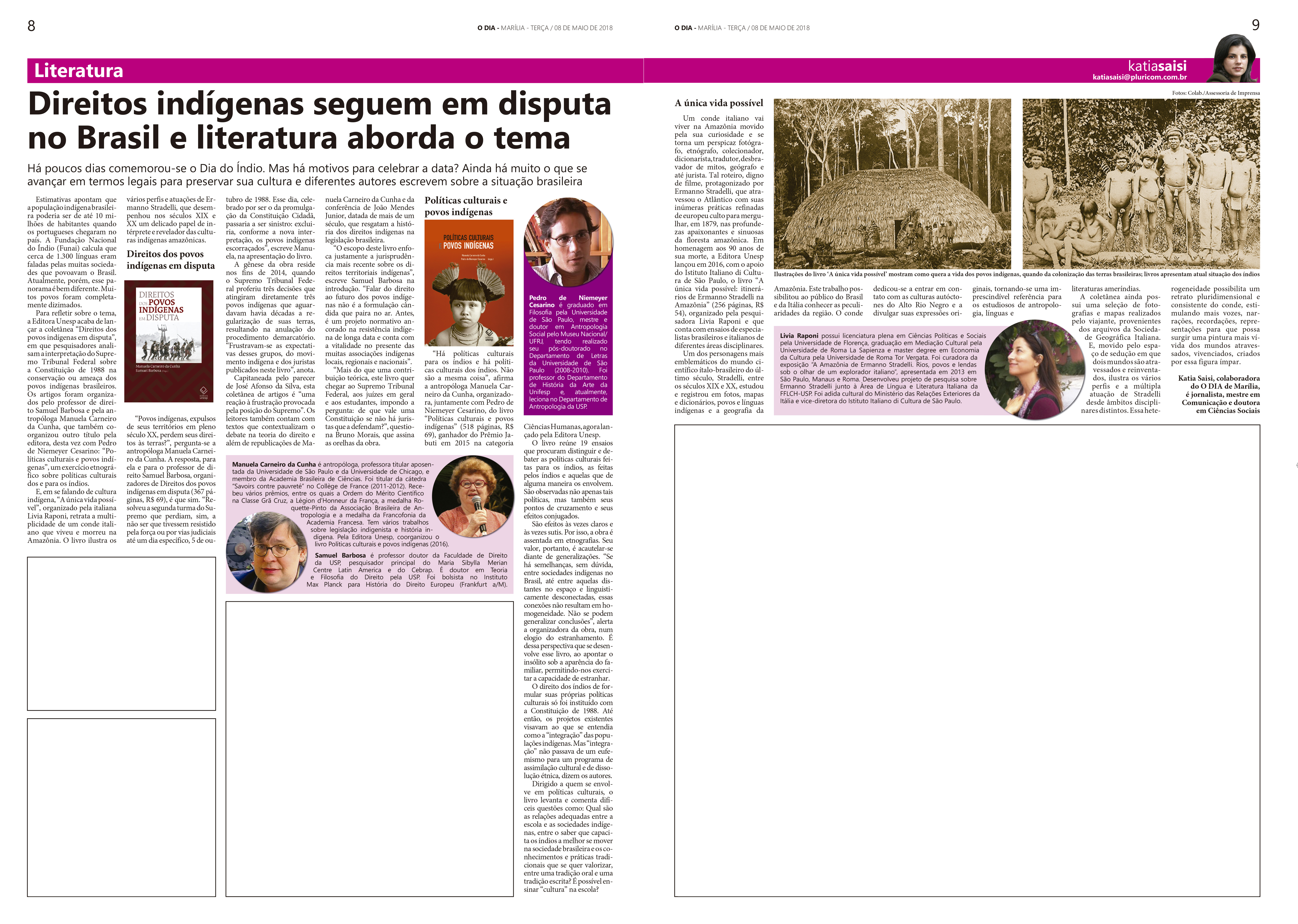 O jornal O Dia, de Marília, em sua edição de 8 de maio, destacou os livros Direitos dos povos indígenas em disputa, organizado por Manuela Carneiro da Cunha e Samuel Rodrigues Barbosa, Políticas culturais e povos indígenas, organizado por Manuela Carneiro da Cunha e Pedro de Niemeyer Cesarino, e A única vida possível, organizado pela italiana Livia Raponi.