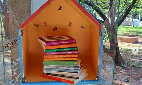 Com o tema “Leve um livro, deixe outro”, uma simpática casinha de pássaros abriga um local para que as pessoas peguem livros e deixem novos títulos com intuito de recircular exemplares e fomentar a leitura.