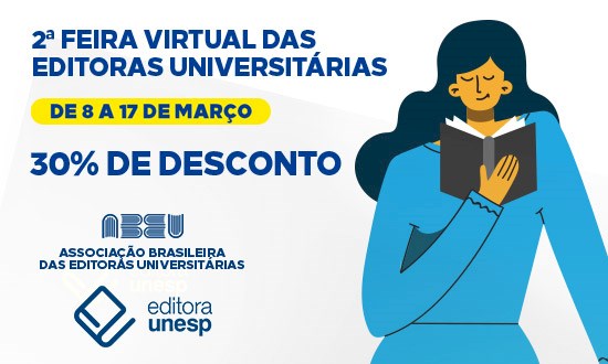 A Editora Unesp participa da 2ª Feira Virtual das Editoras Universitárias, promovida pela Associação Brasileira das Editoras Universitárias (Abeu), que acontece de 8 a 17 de março, no site www.feirabeu.com.br. São 60 editoras nacionais e 24 editoras latino-americanas. Além de livros com descontos, há uma programação cultural on-line.