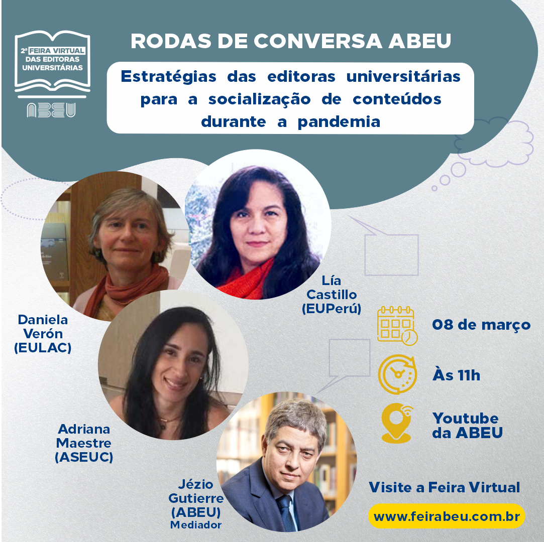 Na ocasião, a mesa será mediada por Jézio Hernani Bomfim Gutierre, diretor de Difusão Editorial da Abeu e diretor-presidente da Fundação da Editora Unesp. Ele irá conversar com Daniela Verón, da Asociación de Editoriales Universitarias de América Latina y el Caribe (EULAC); Lía Castillo, da EU Perú - Editoriales Universitarias e Académicas; e com Adriana Maestre, da Asociación de Editoriales Universitarias de Colombia (ASEUC).