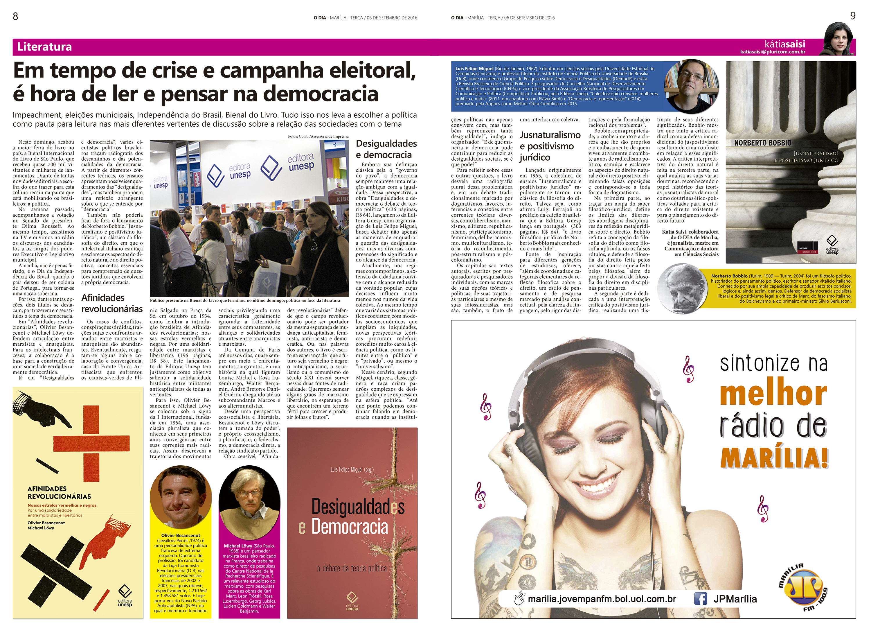 O jornal O Dia de Marília, em sua edição de 6 de setembro, destacou três lançamentos da Editora Unesp na Bienal Internacional do Livro de São Paulo que abordam a política como pauta para leitura: Afinidades revolucionárias: Nossas estrelas vermelhas e negras. Por uma solidariedade entre marxistas e libertários, de Olivier Besancenot e Michael Löwy; Desigualdades e democracia: O debate da teoria política, organizado por Luis Felipe Miguel; e Jusnaturalismo e positivismo jurídico, de Norberto Bobbio.