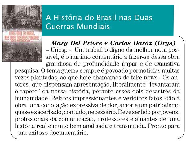 O jornal Empresas e Negócios recomendou a leitura do lançamento da Editora Unesp A história do Brasil nas duas guerras mundiais, organizado Mary Del Priore e Carlos Daróz. A obra permite ao leitor ultrapassar as linhas gerais em que são descritas as participações brasileiras nos dois grandes conflitos mundiais e observar de posição privilegiada o que ocorria na trincheira, no navio, na caserna.