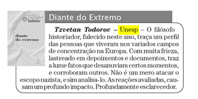 O jornal Empresas e Negócios, em sua edição de 13 de novembro, destacou o lançamento Diante do extremo, de Tzvetan Todorov. Todorov mergulha em vasta literatura memorialista dos sobreviventes de campos de concentração, nazistas e soviéticos, e em depoimentos de agentes desses regimes para nos mostrar que a vida nesses lugares, ao contrário do que é comum que se acredite, não perdeu sua dimensão moral.