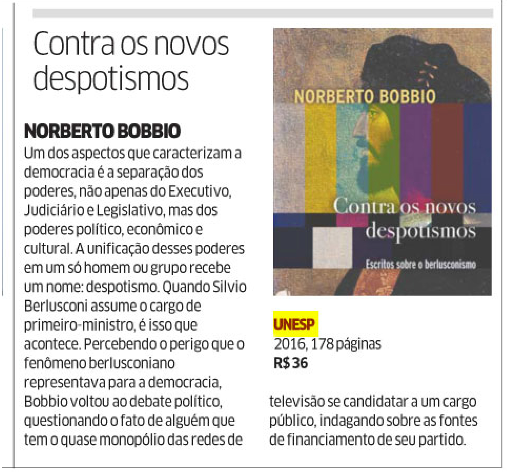 No último dia 25 de dezembro, o jornal Diário do Nordeste indicou o livro Contra os novos despotismos: escritos sobre o berlusconismo, de Norberto Bobbio.