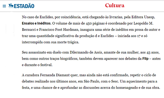 A jornalista Maria Fernandes Rodrigues anunciou, em 9 de novembro, o lançamento da Editora Unesp previsto para este mês: Ensaios e inéditos, dos organizadores Leopoldo M. Bernucci e Francisco Foot Hardman. Confira a seguir:
