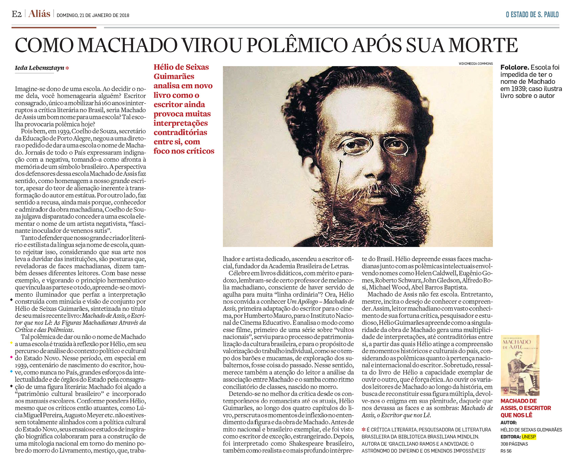 O jornal O Estado de S. Paulo, em sua edição de 21 de janeiro de 2018, destacou o livro Machado de Assis, o escritor que nos lê: as figuras machadianas através da crítica e das polêmicas, de Hélio de Seixas Guimarães. Hélio de Seixas Guimarães há muitos anos se debruça não só sobre a obra de Machado de Assis, mas também sobre sua recepção pela crítica e pelos leitores. Nesta obra, contudo, ele não tencionou compor uma história dessa recepção, missão já realizada em outros trabalhos – como, por exemplo, os de José Galante de Sousa, Jean-Michel Massa e Ubiratan Machado, que têm procurado organizar a fortuna crítica mais extensa das nossas letras.