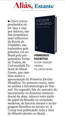 O Estado de S. Paulo, em sua edição de 22 de fevereiro, indicou a leitura do lançamento Primeiros escritos filosóficos, de Theodor W. Adorno. Tais escritos abrem uma importante janela para o primeiro momento do trabalho filosófico de Adorno e permitem estabelecer conexões e contrastes com seu pensamento ulterior.