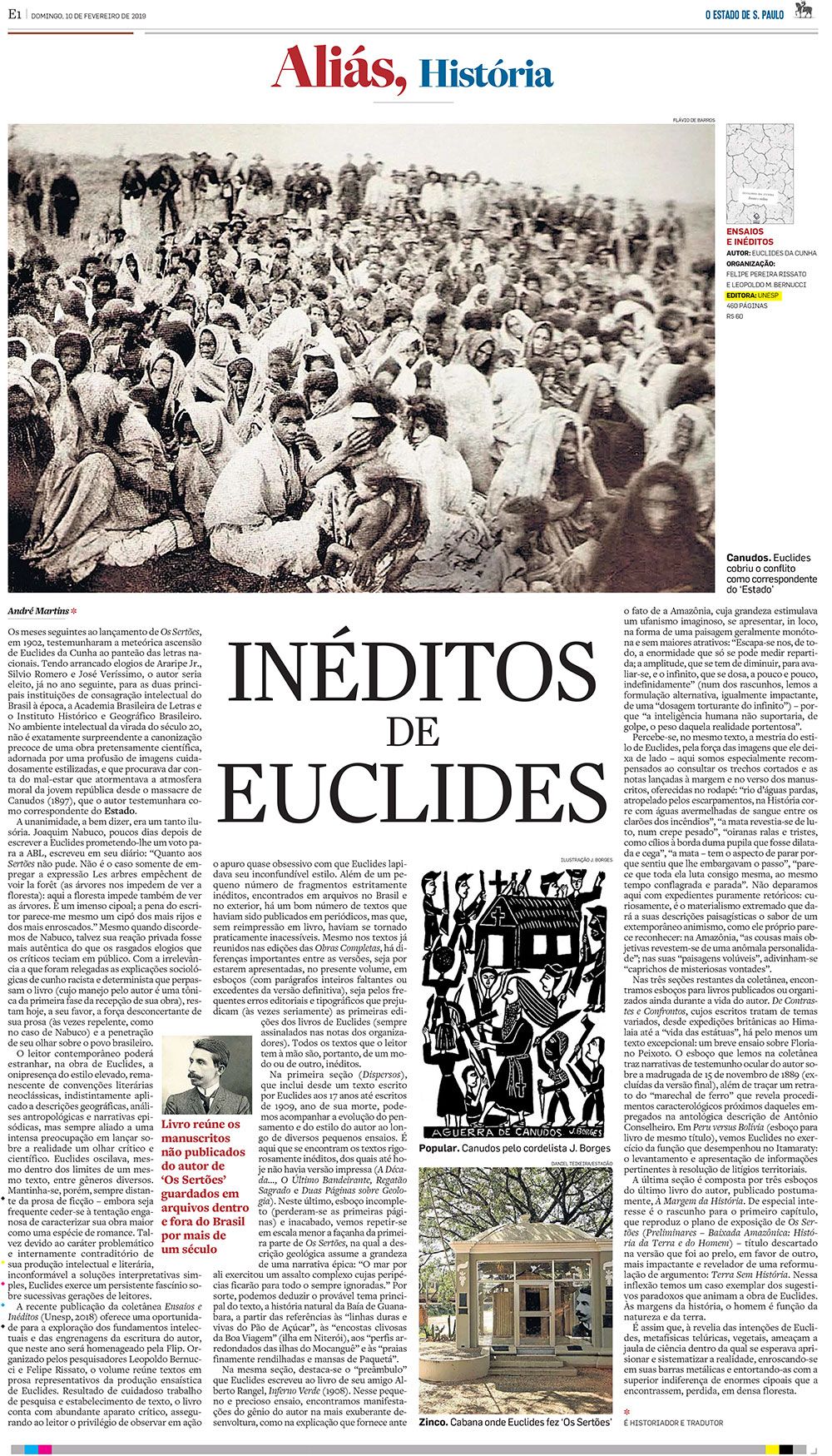 O Estado de S. Paulo, em sua edição de 10 de fevereiro, recomendou a leitura do lançamento Ensaios e inéditos, de Euclides da Cunha, organizado por Leopoldo M. Bernucci e Felipe Pereira Rissato. Com o presente volume, que inaugura a série de inéditos em prosa de Euclides da Cunha, os leitores terão acesso a um número significativo de ensaios do autor, cuja produção se inicia em 1883, quando ele tinha apenas 17 anos, e termina em 1909, ano de sua morte. Trata-se de um total de 31 composições de Euclides que, em seu conjunto, reforçam a vertente ensaística de sua admirável escritura e que ficou consolidada definitivamente em Os sertões.