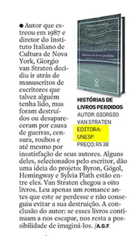 O carderno Aliás, do Estado de S. Paulo, em sua edição de 26 de agosto, recomendou o livro Histórias de livros perdidos, de Giorgio van Straten. Este livro conta a jornada em busca de oito livros perdidos, livros quase míticos: todos aqueles que os procuram estão certos de que existem e de que vão encontrá-los, mas ninguém realmente tem provas concretas e conhece rotas seguras até eles. Muitas vezes, as pistas são fugazes e a esperança de encontrar essas páginas é mínima. Mesmo assim, a viagem vale a pena.