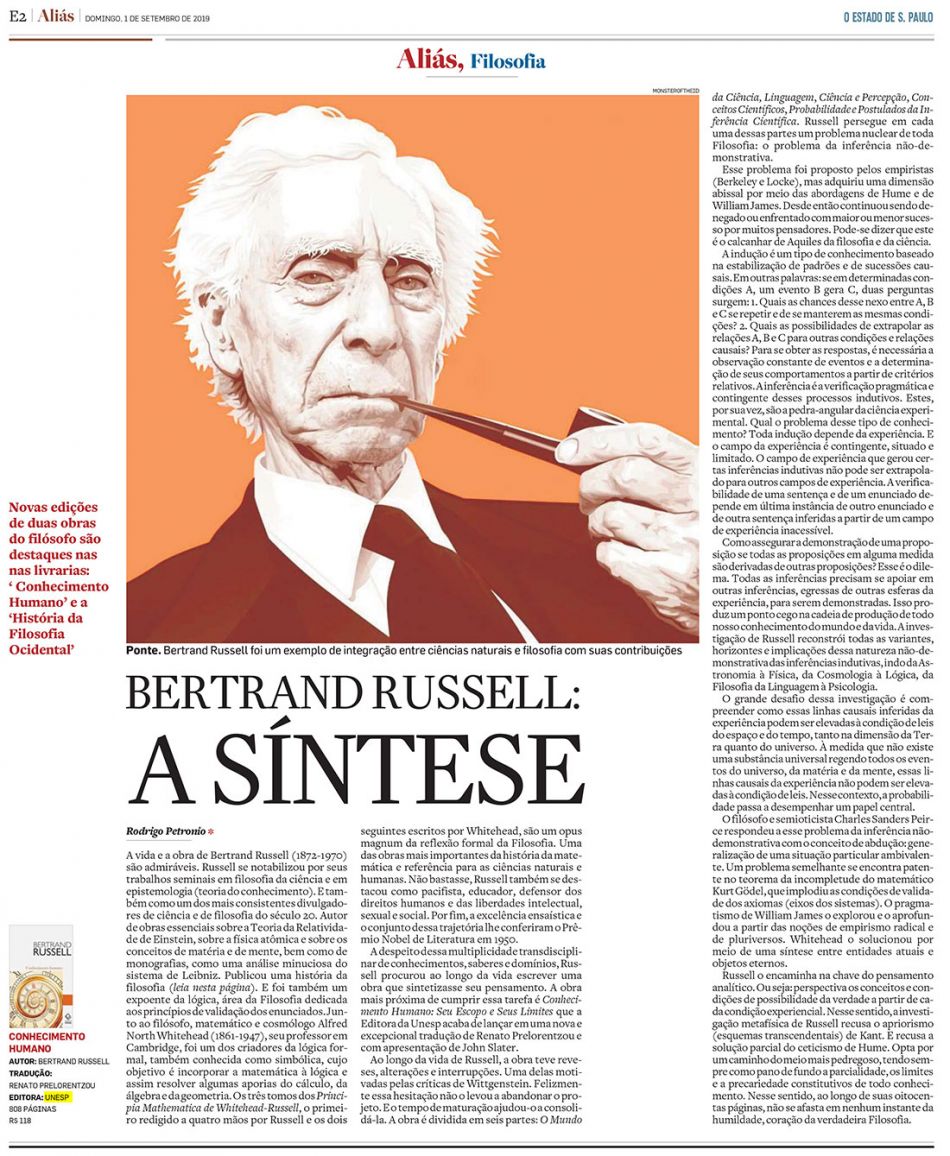 O Estado de S. Paulo recomendou a leitura de Conhecimento humano: seus escopos e seus limites, de Bertrand Russell. A obra é o último grande livro de Russell, e seu tema – o problema da inferência não demonstrativa – tem sido preocupação central dos filósofos desde que Hume erodiu os argumentos indutivos.