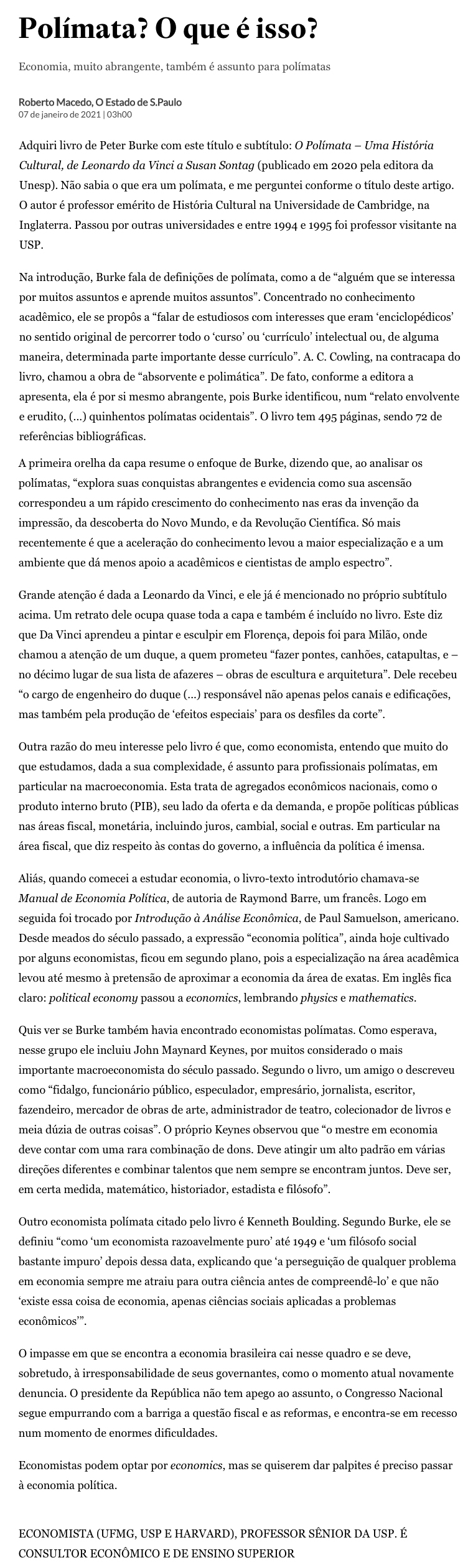 O jornal O Estado de S. Paulo destacou o livro O polímata: Uma história cultural de Leonardo da Vinci a Susan Sontag, de Peter Burke, no texto "Polímata? O que é isso?", assinado pelo economista Roberto Macedo. Ele destaca a profundidade com que o historiador inglês lida com a polimatia.