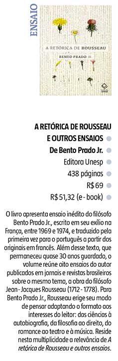 O jornal Estado de Minas, em sua edição de 12 de abril, recomendou a leitura de Aretórica de Rousseau: e outros ensaios, de Bento Prado Jr. O exame da recepção dos escritos de Rousseau constitui o pano de fundo perante o qual Bento Prado Júnior apresenta sua tese sobre os auditórios: a unidade do pensamento – ou da teoria – infere-se da tipologia dos sujeitos discursivos, quer no interior da própria obra (seja esta coerente ou não), quer na trama entre o autor e seu público.