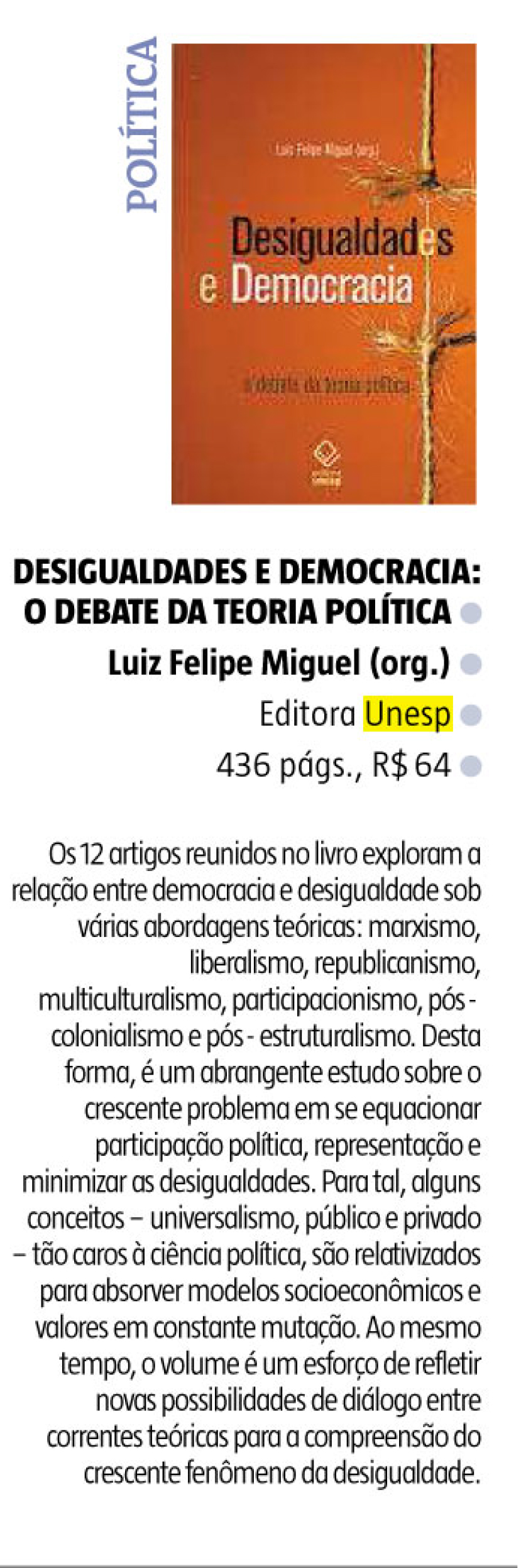 O jornal Estado de Minas indicou, em sua edição de 11 de novembro, o livro Desigualdades e democracia, de Luis Felipe Miguel.