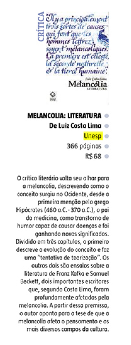 O jornal Estado de Minas, em sua edição de 20 de outubro, recomendou a leitura do lançamento Melancolia: Literatura, de Luiz Costa Lima. Nesta obra, Costa Lima recupera as acepções históricas e filosóficas da melancolia para estabelecer a articulação desse estado afetivo com a literatura. No percurso dessa investigação, o autor reconhece a condição de “criatura carente” no caráter humano – pathos da melancolia no discurso ficcional e plástico.