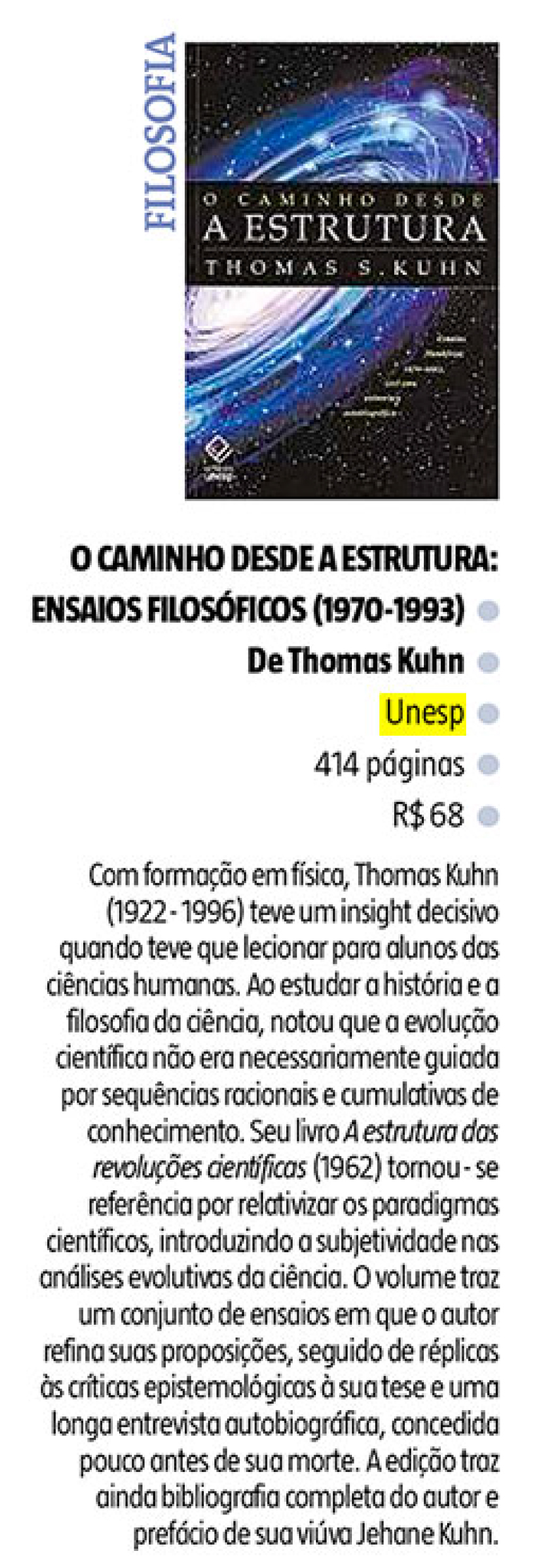 O jornal Estado de Minas, em sua edição de 25 de maio, indicou a leitura do livro O caminho desde A estrutura – 2ª Edição, de Thomas S. Kuhn. Dividido em três partes, O caminho desde A estrutura é o mais completo registro disponível dos novos rumos que Thomas Kuhn estava trilhando durante as últimas duas décadas de sua vida. A primeira parte do livro consiste de ensaios tópicos nos quais o autor refina os conceitos fundamentais elaborados em A estrutura. Na segunda parte, Kuhn responde extensivamente às críticas dirigidas a suas contribuições anteriores. A terceira parte do volume é composta pela transcrição de uma notável entrevista autobiográfica concedida por Kuhn em Atenas, em 1995, menos de um ano antes de sua morte.