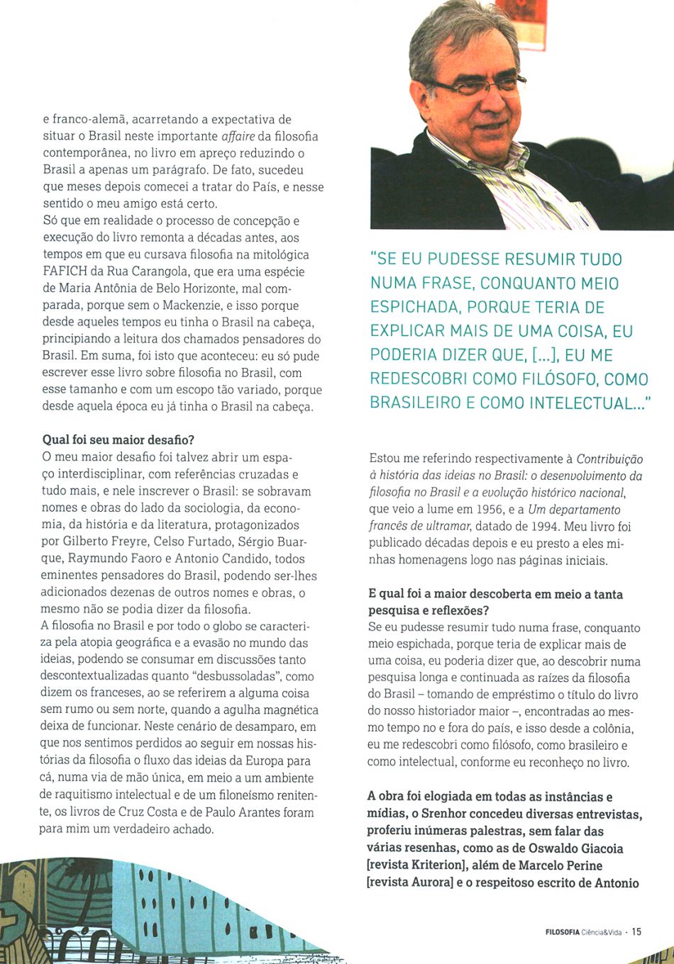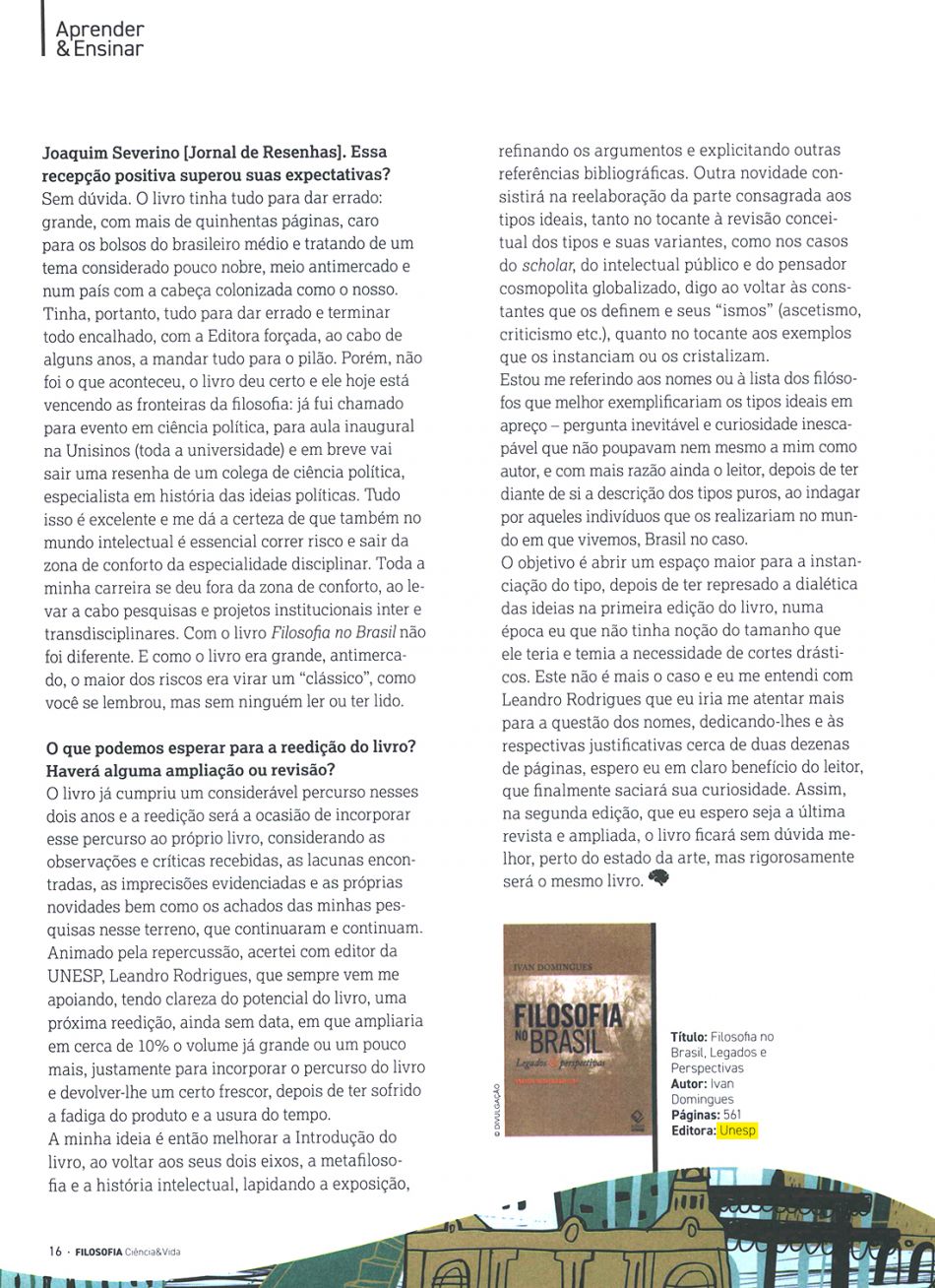 A jornalista Cristina Almeida, da revista Filosofia Ciência e Vida, entrevistou Ivan Domingues, autor de Filosofia no Brasil, que compartilhou um pouco do processo de crianção do livro, desafios, surpresas e expectativas a partir de agora.